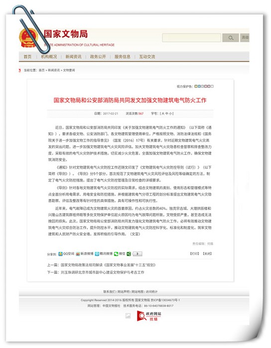 近日,國家文物局和公安部消防局共同印發(fā)《關(guān)于加強(qiáng)文物建筑電氣防火工作的通知》(以下簡稱《通知》),要求各級文物、公安消防部門、各文物建筑管理使用單位,嚴(yán)格按照文物、消防法律法規(guī)和《國務(wù)院關(guān)于進(jìn)一步加強(qiáng)文物工作的指導(dǎo)意見》(國發(fā)〔201617號)有關(guān)要求,針對近期文物建筑電氣火災(zāi)高發(fā)的突出問題,進(jìn)一步加強(qiáng)文物建筑電氣火災(zāi)風(fēng)險評估,加大文物建筑電氣火災(zāi)隱患檢查督察和排查整改力度,采取有效的電氣火災(zāi)防護(hù)技術(shù)措施,切實減少火災(zāi)危害,全面加強(qiáng)文物建筑電氣防火工作,確保文物建筑消防安全。
